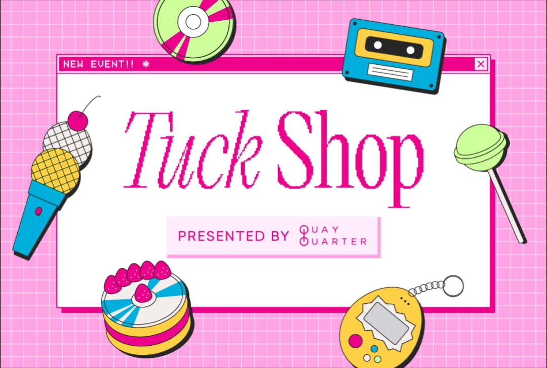 Fusing iconic 90s gadgets with classic sugary treats, Tuck Shop’s campaign identity boasts the best of sweet nostalgia. An electric colour palette with hot pink and cyan embodies Y2K trends while integrating Vivid’s branding. The hero graphic of stacked plates is a simple yet punchy nod to the event’s canteen concept, and general enough to accommodate all the chefs and vendors. High-impact illustrations were introduced for a second push of ticket sales and let in-situ creative stand out within the large venue. Combined, the hero graphic and illustrations were versatile to use across market placements, continually garnering interest.